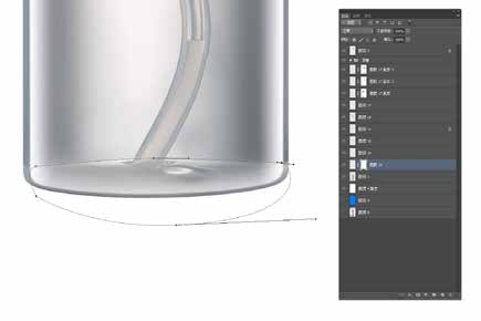 62 竖向的光带制作完成后,要为透明瓶盖的顶部转角添加一条横向的高光(用钢笔工具勾出选区,载入选区后,新建图层,填充白色,设置高斯模糊的“半径”为1,用蒙版将其擦得“柔和”一些)。这是一道很细很细的高光,但会让透明瓶盖显得很真实。