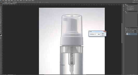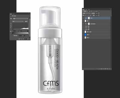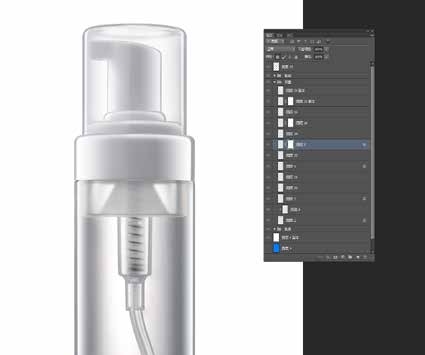 因为最终画面是白色透明瓶出现在白底上,所以瓶子各部分组成的对比度也不要太强,明暗之间的过渡不要太强烈,因此用白色画笔把瓶子修得柔和一些。