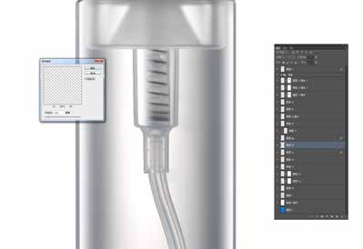 具体做法是:首先抠出这一部分,复制为单独的图层,锁定此图层,用仿制图章工具把边缘擦干净;然后新建空白图层,按Ctrl+Alt+G组合键将其载入刚才抠出的瓶胆图层,用白色画笔来刷边缘(这次用30%的不透明度),边缘出现一圈白色光条,此时瓶胆的轮廓即处理完成。