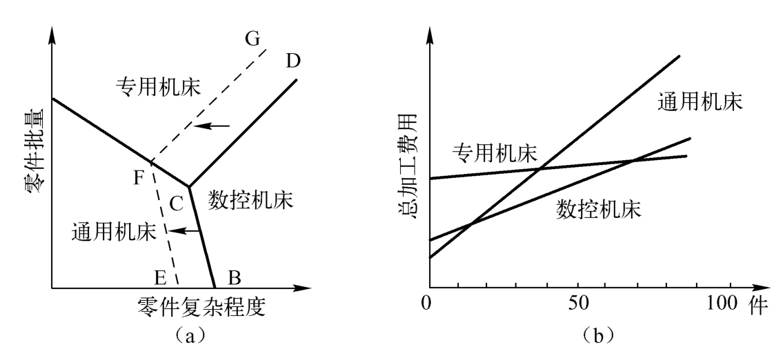 图1-5(a)所示为随零件复杂程度和生产批量的不同,3种机床的应用范围的变化。当零件不太复杂且生产批量又较小时,宜采用通用机床;当生产批量很大时,宜采用专用机床;而随着零件复杂程度的提高,数控机床越来越显得适用。目前,随着数控机床的普及,应用范围正由BCD线向EFG线复杂性较低的范围扩大。