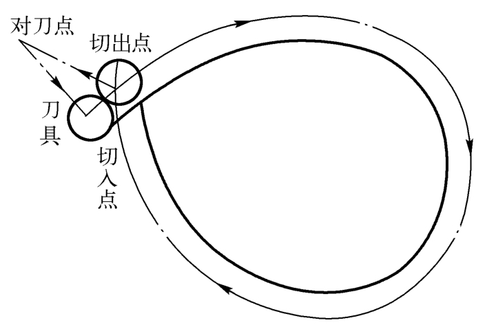 此外,为了提高加工精度和降低表面粗糙度,在铣削封闭的内轮廓时,因为刀具切入、切出不允许外延,所以刀具的切入点和切出点应尽量选在轮廓曲线两几何元素的交点处,如图2-9所示。