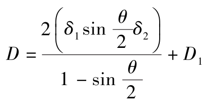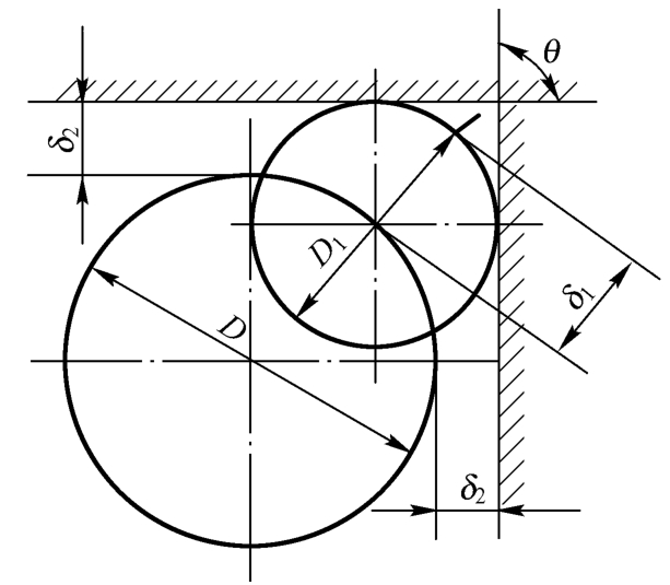 式中,D 1 为轮廓最小圆角直径;δ 1 为圆角邻边夹角等分线上的精加工裕量;δ 2 为精加工裕量;θ为圆角两邻边的最小夹角,如图2-14所示。