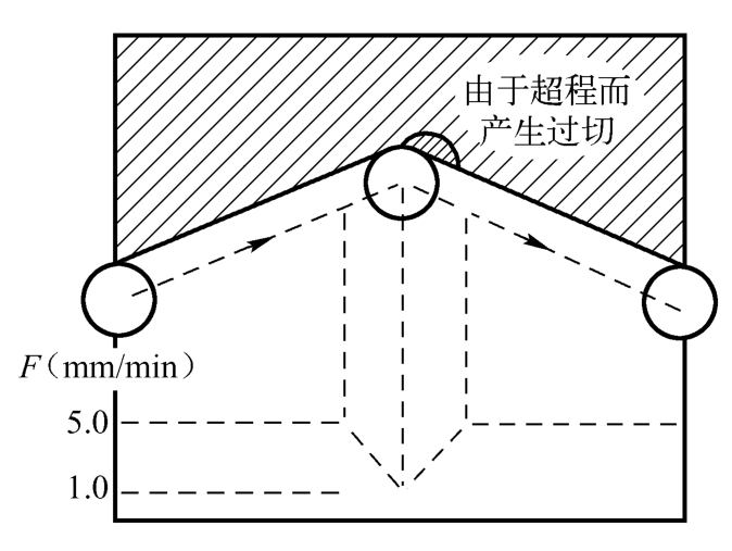 在轮廓加工中选择进给速度时,应注意由于惯性作用,在轮廓拐角处会出现“超程”的现象。当拐角较大、进给速度较高时,应采取在接近拐角处适当降速,在拐角后再逐渐升速的办法来保证加工精度,如图2-15所示。另外还应注意,在轮廓加工中,当刀具改变运动方向时,由于运动的滞后,还会产生“欠程”现象,导致“欠程误差”。