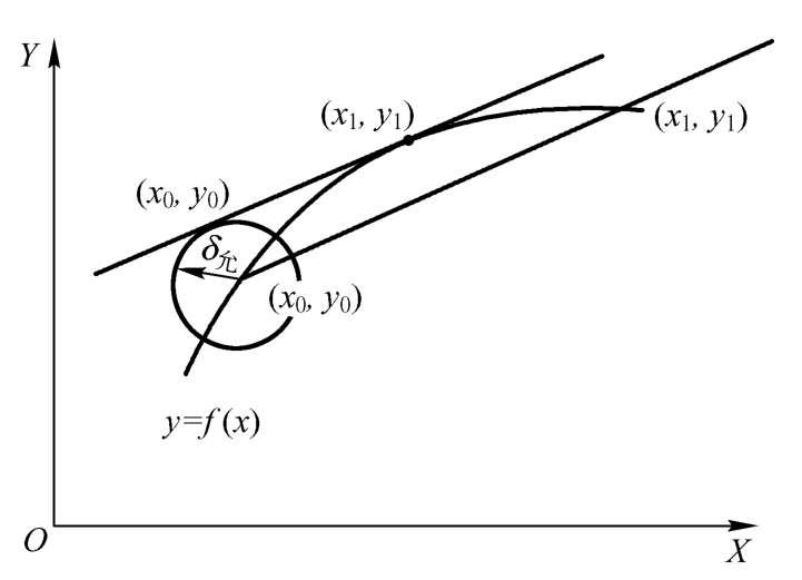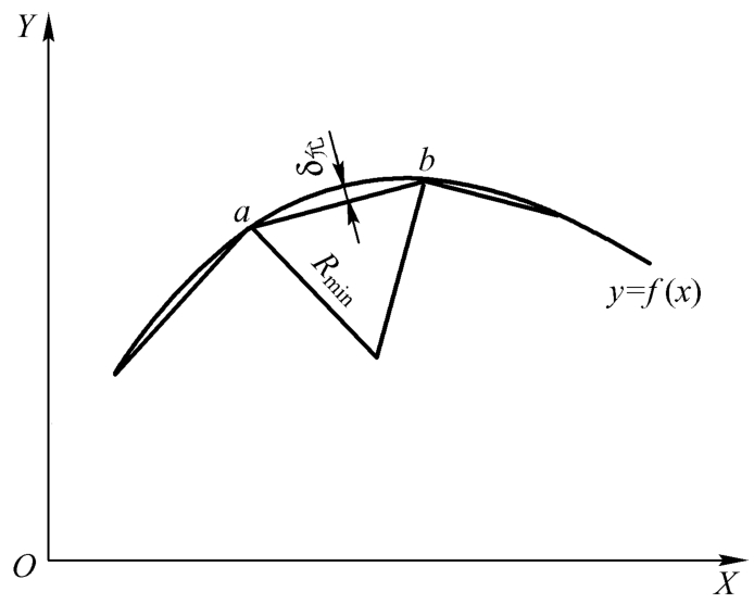 这种方法的关键是确定间距值。该值应保证曲线y=f(x)和相邻两个节点间的法向距离小于允许的程序编制误差,即δ≤δ 允 。在实际生产中,常根据加工精度要求凭经验选取间距值,如取Δx=0.1mm,然后验算误差的最大值是否小于δ 允 。