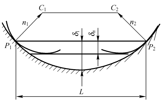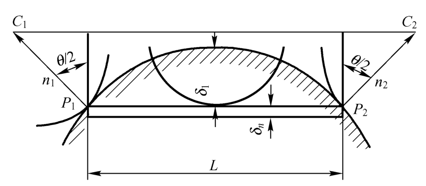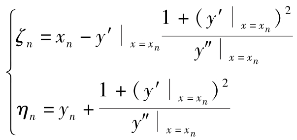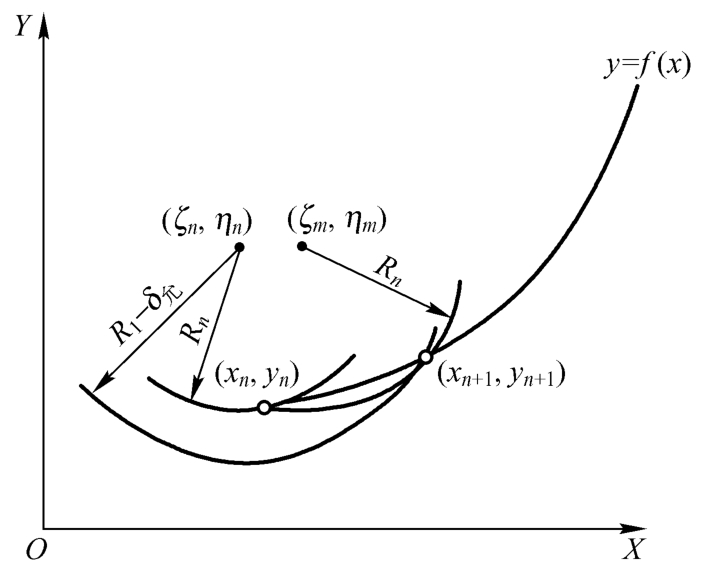 式中,当轮廓曲线的曲率递减时,取(R n +δ 允 )为半径;当轮廓曲线的曲率递增时,取(R n -δ 允 )为半径。