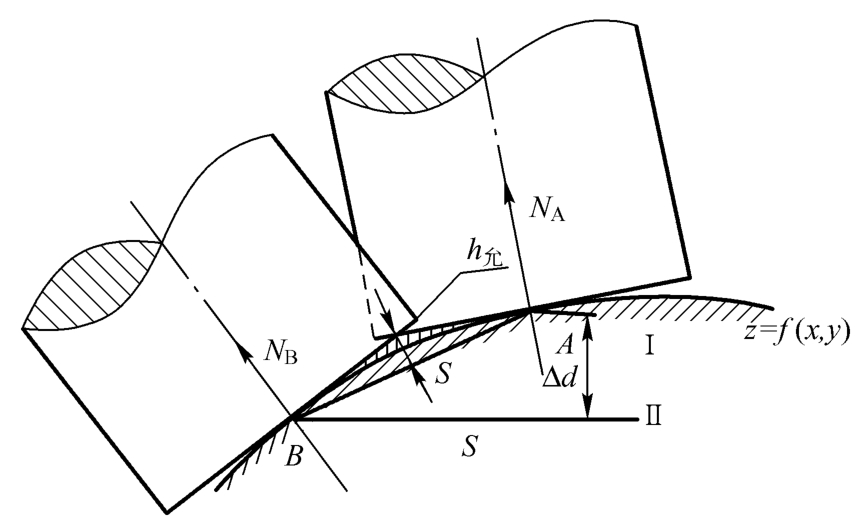 五坐标数控机床用端铣刀加工立体曲面时,也可采用行距法来实现。其行间距与被加工零件的表面不平度要求有关,如图2-28 所示。首先求出 B 点坐标值(可用平面零件节点的算法求出),然后即可求出S。由于B 点的曲线法矢量方向与 A点的法矢量方向不同,因此这种算法是一种近似算法。同时还需要检验Ⅰ—Ⅱ正截面间其他各节点的h值是否超差,以及刀具半径能否使两个加工面搭接。