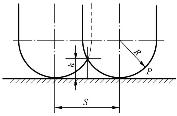 采用行距法进行加工时,行距和步长的大小都会影响零件曲面的精度、表面粗糙度和程序段的长度。行距法加工时的行距计算示意图如图2-24所示。用球头铣刀加工复杂立体曲面时,刀痕在行间构成加工表面的不平度h,称为切痕量。