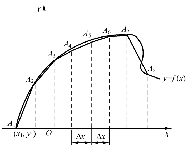 1)圆弧分割法 圆弧分割法应用在曲线y=f(x)为单调的情形。若非单调曲线,可以在拐点处将曲线分段,使每段曲线为单调曲线,如图2-19 所示。其计算方法如下所述。