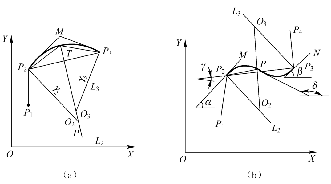 双圆弧法在两个列表点(型值点)之间用两段彼此相切的圆弧来逼近列表曲线,而彼此相切的两段圆弧的参数则是通过包括两个列表点在内的4个连续列表点来确定的,当4个连续列表点中的第1点和第4点在中间两点连线的同侧时,可用两段彼此内切的圆弧来逼近,如图2-21(a)所示。图中是通过 P 1 、P 2 、P 3 和P 4 四个列表点确定的过P 2 和P 3 两个点的彼此相内切的逼近圆弧,其圆心分别为O 2 和O 3 。