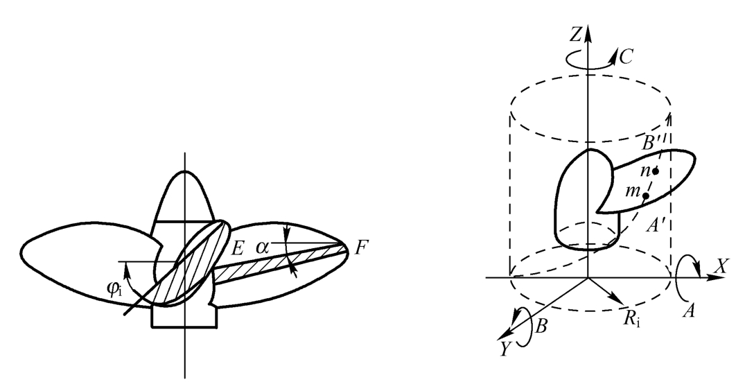 图2-27所示的是用端铣刀在五坐标联动数控机床上加工螺旋桨的例子。为了加工出叶片的形状(实际上A′B′为螺旋线),要采用Z坐标、C坐标和X坐标。为了保证铣刀端面与曲面法矢量垂直,铣刀还应做螺旋升角中 φ i (坐标A)与后倾角α(坐标B)上的摆动运动。在摆动的同时,还有X向及Z向的附加位移,以保持铣刀端面中心位于切削点的位置,因此叶面的加工需要 X、Z、A、B、C五个坐标联动来完成。
