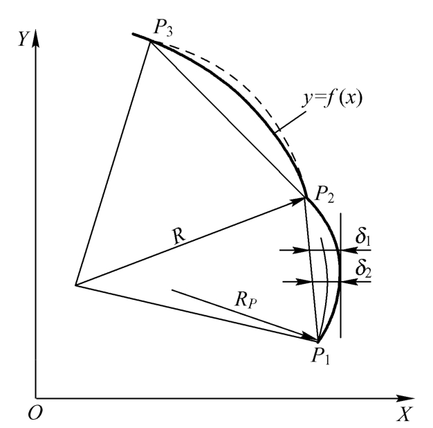 2)三点作图法 首先用直线逼近法计算出轮廓曲线的节点坐标,然后再通过连续的3个节点作圆,此方法称为三点作图法。过连续3点的逼近圆弧的圆心坐标及半径可用解析法求得。
