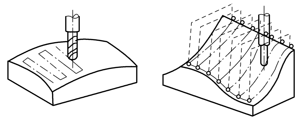 无论是解析曲面还是自由曲面,在加工中都要根据曲面的形状、刀具的形状及精度的要求采用不同的铣削方法。