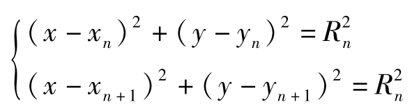 所求两个节点间的逼近圆弧是以(x n ,y n )为始点,以(x n+1 ,y n+1 )为终点,以R n 为半径的圆弧。为求此圆弧圆心的坐标,可分别以(x n ,y n )和(x n+1 ,y n+1 )为圆心,以R n 为半径作两个圆弧,两个圆弧的交点即为所求圆心的坐标,即解联立方程: