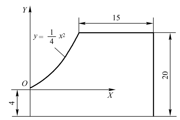 (7)在一个具有直线插补功能的数控机床上加工如图2-31所示的零件,试用等步长法确定加工曲线段时的插补步长,并计算出第一节点的坐标(插补误差δ 允 =0.02,起点为O)。