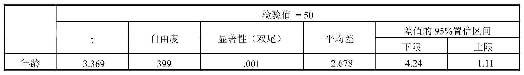 由表5-6可以看出,显著性(双尾)为0.001,小于0.05,即拒绝零假设,认为样本数据的平均年龄不等于50。