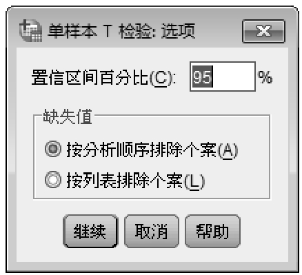 按钮,弹出如图5-5所示的“单样本T检验:选项”对话框,选项为系统默认。单击
