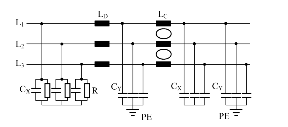 下面再举一个三相电源线滤波器电路结构的例子,供有这方面需要的读者参考。如图 5-40 所示,其中,L C =1.5mH,L D =100μH,R=1MΩ,C X =0.47μF,C Y =4.7nF。图 5-40中,L D 为差模滤波电感,与 C X 、R 组成差模滤波电路;L C 为共模滤波电感,与两组 C Y 组成共模滤波电路,电感、电容都为三组,即每一相的线路具有滤波效果。