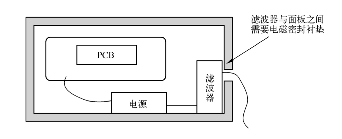 滤波器的理想安装方式见图 5-38,将滤波器直接安装在面板上,利用机箱的金属面板将滤波器的输入端和输出端隔离开。