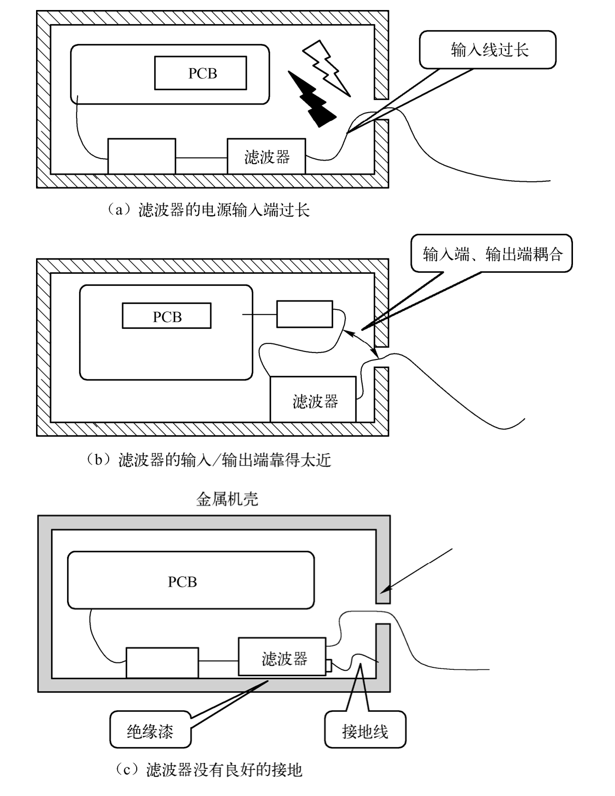 (2)图 5-39(b)的错误在于滤波器的输入/输出线靠得太近。导致这个错误的原因往往是在布置设备内部连线时,为了整齐和美观,将滤波器的输入线和输出线捆扎在一起,这样做的结果是输入线和输出线之间有较大的分布电容,形成了耦合通路,使高频电磁干扰能量直接从滤波器输入线耦合到了输出线,等于把滤波器给旁路掉了,从而导致滤波器的高频滤波性能变差。