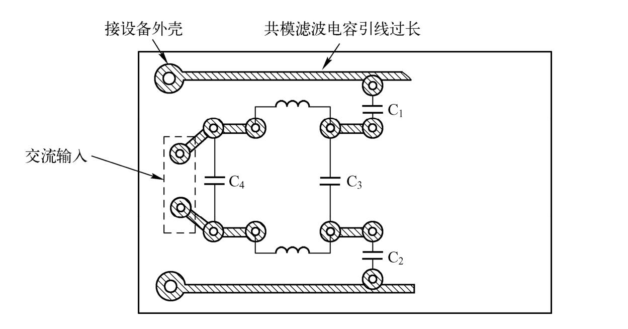 (2)大部分电路板设计人员不了解电源线滤波器的真正原理,不能进行最佳布线,常见的错误是共模滤波电容的接地引线过长,甚至不将共模滤波电容的地线连接到设备外壳上,如图5-37所示。