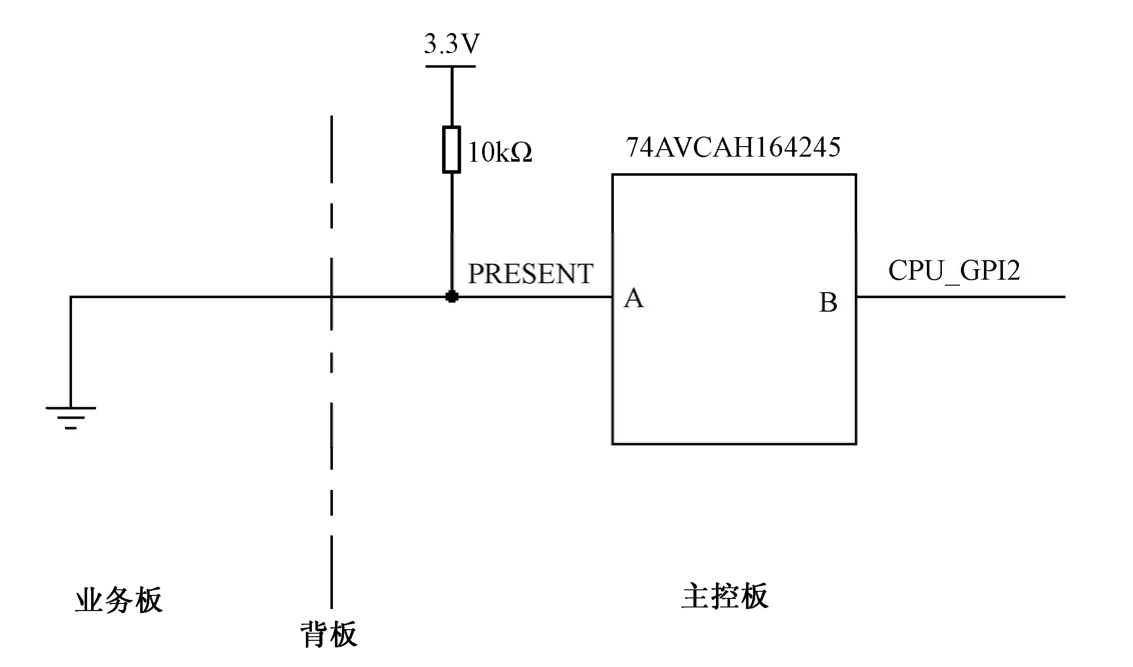 业务板的在位信号(PRESENT)通过背板连接到主控板逻辑驱动器件74AVCAH164245 的输入端,在业务板上,该信号直接接地,在主控板上,该信号通过10kΩ电阻上拉到 3.3V,PRESENT 信号经驱动后得到 CPU_GPI2 信号,连接到 CPU 的GPIO(通用输入/输出接口)。当业务板插入时,在位信号变为低电平,CPU_GPI2输出低电平,通知 CPU,该槽位的业务板已插入;当业务板拔出时,在位信号变为高电平,CPU_GPI2输出高电平,通知CPU,该槽位的业务板已拔出。