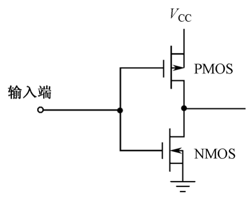 常用的逻辑器件,如 74LV、74AC、74AHC、74HC等系列,都属于 CMOS 器件。CMOS 器件的输入端由栅极连接在一起的一对 PMOS 和 NMOS 构成,如图 3.2 所示。当输入低电平时,PMOS 导通而 NMOS 关闭,输入高电平时,PMOS 关闭而 NMOS 导通,在理想状况下,两个MOS管不会同时导通。
