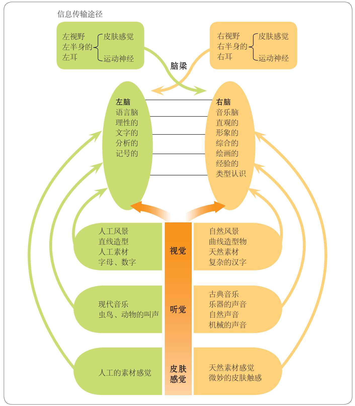 外界的各种信息通过人的“五官”传入大脑。自然的声音是用右脑来接收的。驱动手足的运动神经,从大脑发出信号,然后交叉达到相反的一侧,即左手的运动神经由右脑指挥。“左撇子”由于常用左手进行一系列复杂动作,所以能够在无意中对右脑给予刺激。判断冷热的皮肤感觉神经,也同运动神经一样,相互交叉进入左右脑……