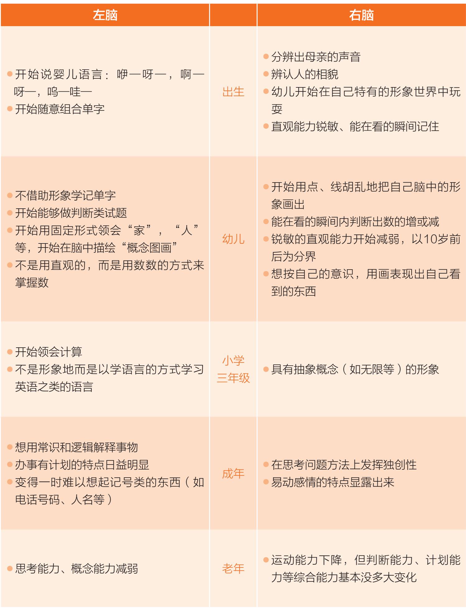 对左右脑功能及与人成长的关系可以归纳为下图: