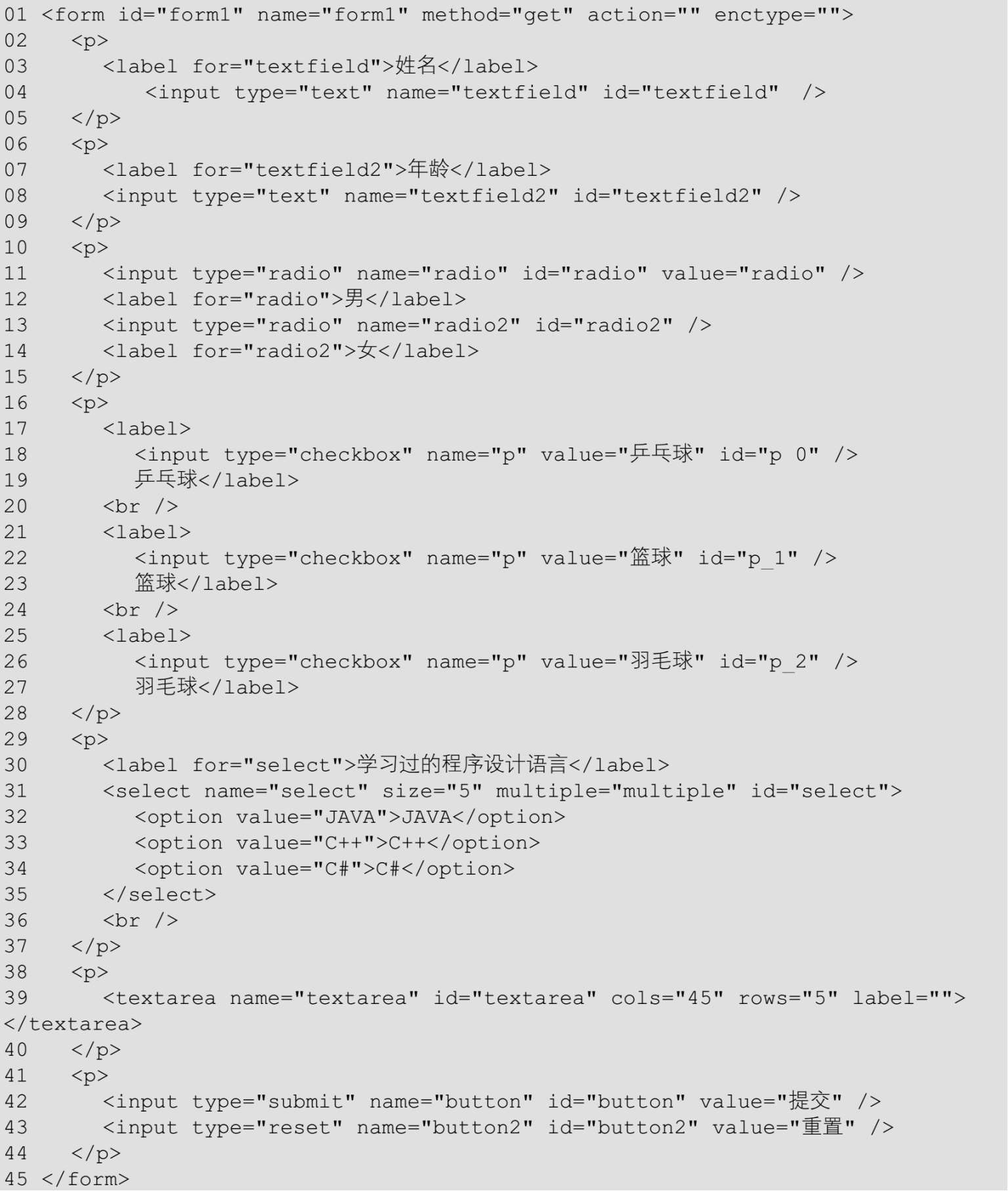 该标签代表HTML文档中的表单。form标签总是成对出现,以<form>标签开始,以</form>标签结束,两者之间是表单的内容。该标签的重要属性如下。