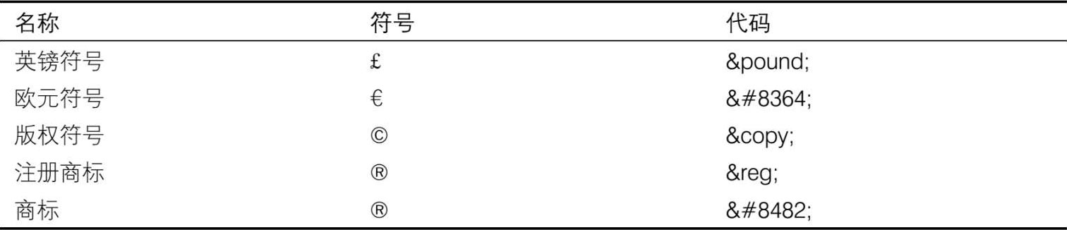 特殊标记是在HTML文档中显示的某些特殊的字符,例如英镑符号£、欧元符号€、版权符号©等。这些符号在HTML里都有固定的代码。常见的符号及其代码如表2-1所示。