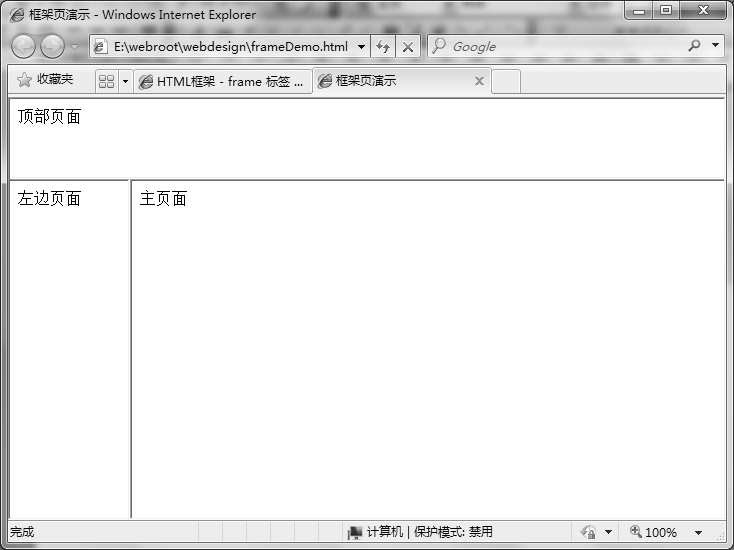 在浏览器中的显示效果如图2-7所示。这是一个非常实用的页面布局,最上面的页面用于显示网站的Logo或者横幅广告,左边的页面用于放置网站栏目,右边的页面用于放置内容。