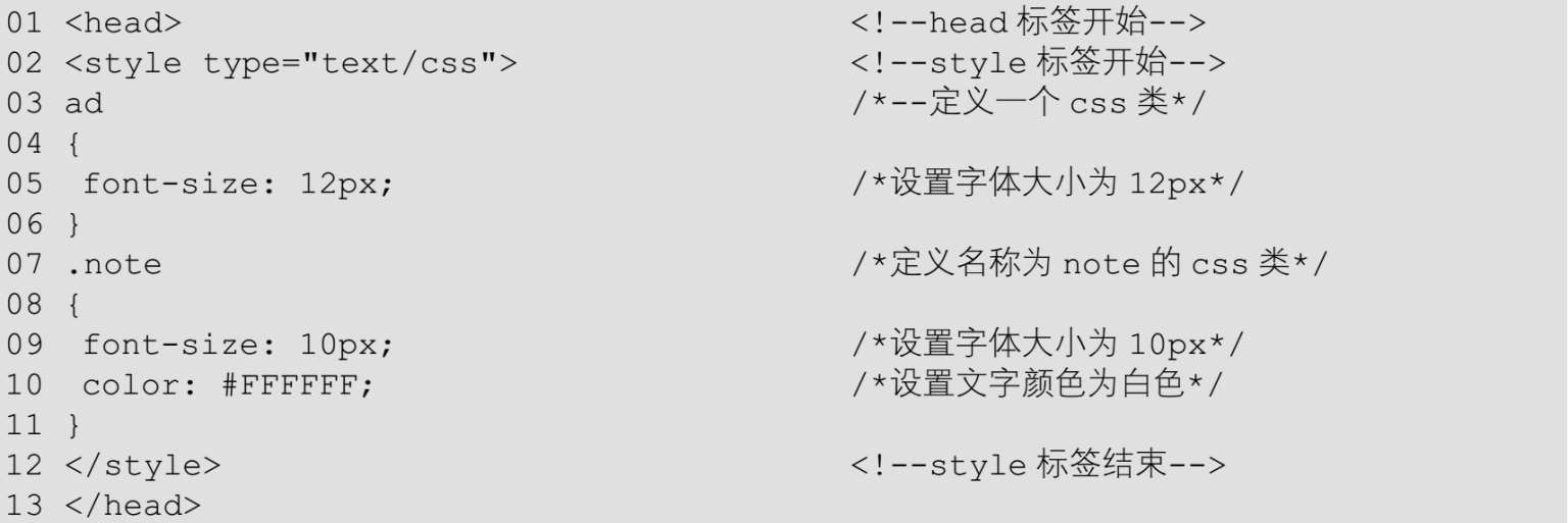 以上代码声明了两个CSS类,其中一个名称为ad,另外一个名称为note。