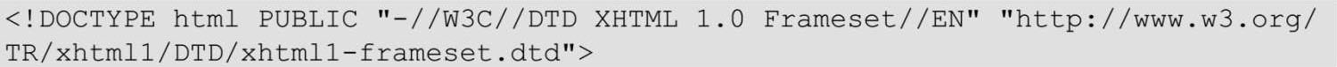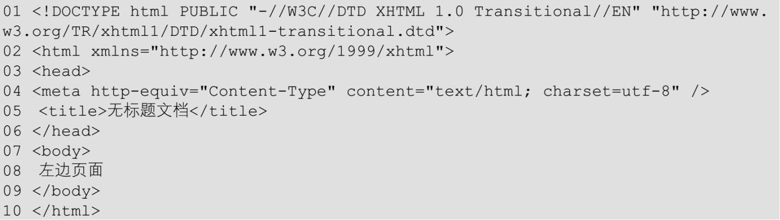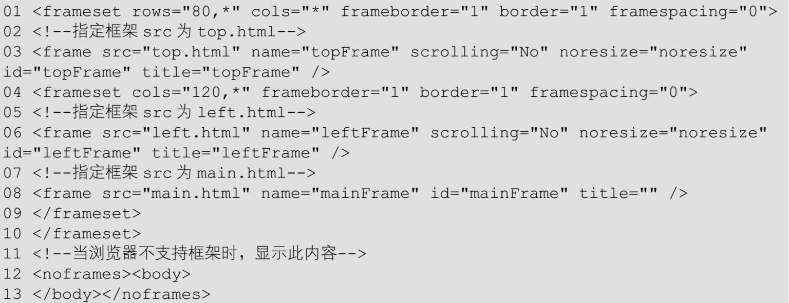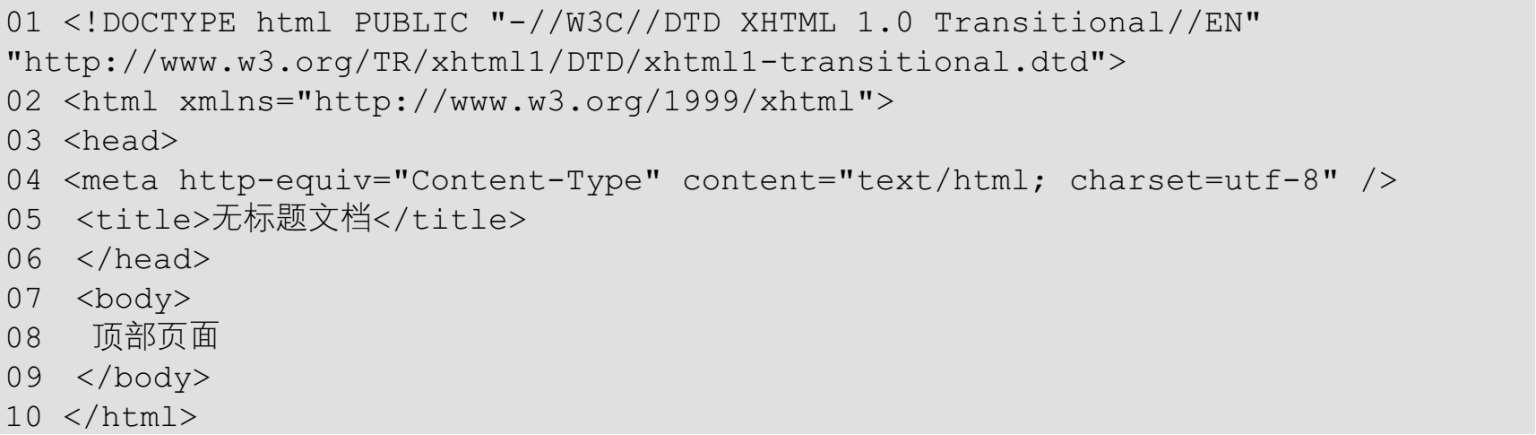 在框架网页里面,frameset标签代替body标签,并且定义了框架将分为多少行与多少列。因此框架页里面不能再含有body标签。frameset标签成对使用,开始标签为<frameset>,结束标签为</frameset>。在使用框架的时候,应该声明支持框架的文档类型: