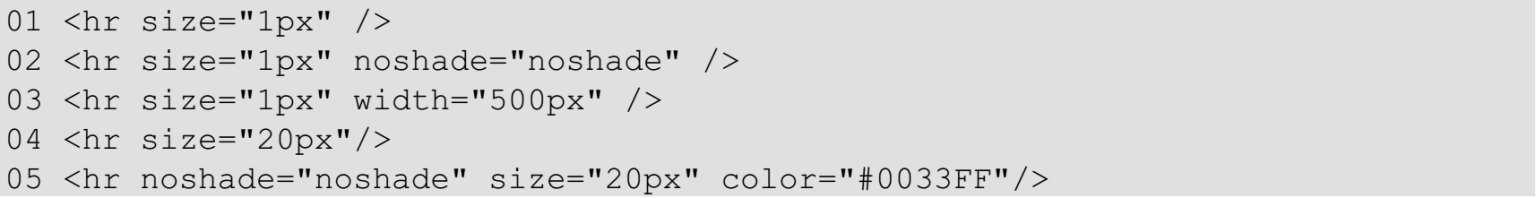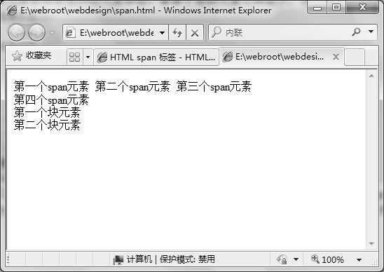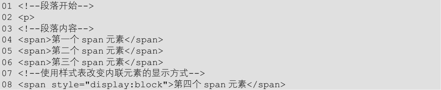 该标签在当前的网页布局当中发挥了举足轻重的作用,div元素结合CSS是目前网页布局的标准。本书在网页布局的章节里面会详细介绍这个标签的使用方法。
