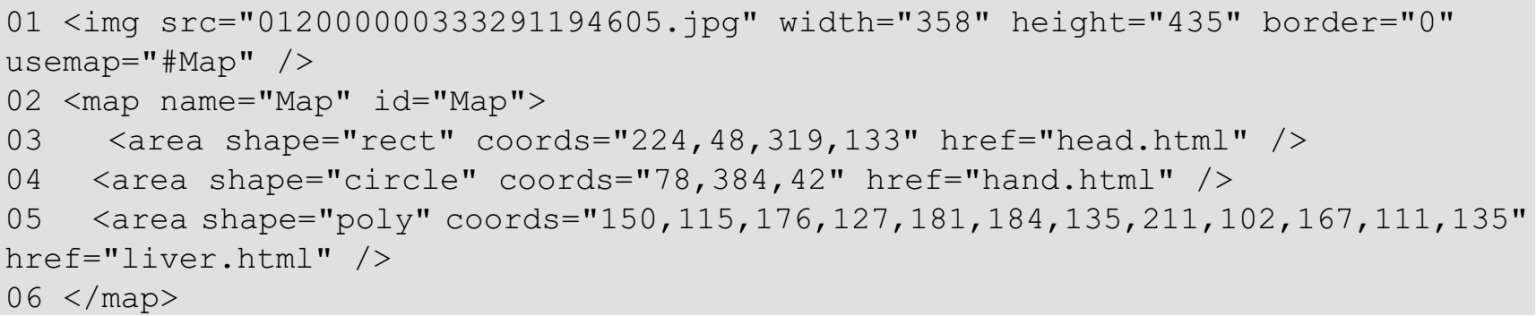 (3) shape: 该属性定义图像中可单击区域的形状,其取值为circle(圆)、poly(多边形)或rect(矩形)。