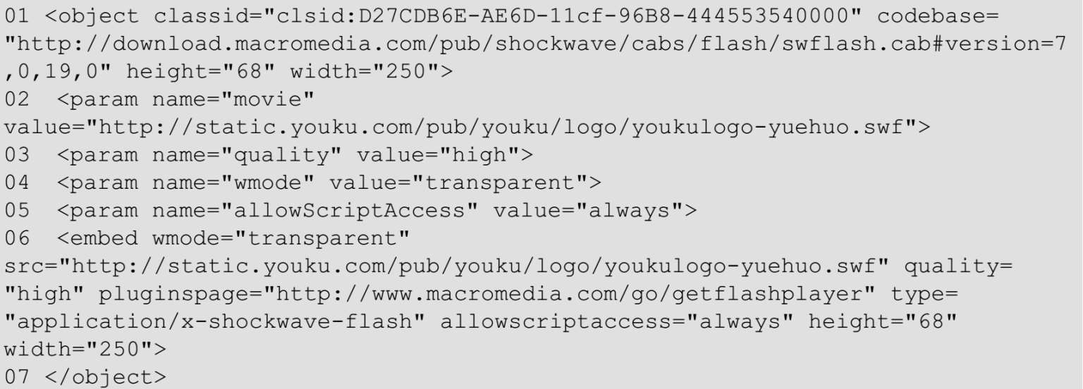 ◆ codebase: 该属性为相对路径提供基URL,IE浏览器通常将此属性中的内容定义为运行嵌入内容所要加载的插件,例如Flash插件的URI为http://download.macromedia.com/pub/shockwave/cabs/director/sw.cab#version=10,1,1,0。