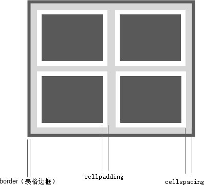 关于表格的属性,可以参考图2-8,图中最外面的深色部分代表border属性,浅灰色部分代表cellspacing属性,白色部分代表cellpadding属性,深灰色部分代表单元格的内容。