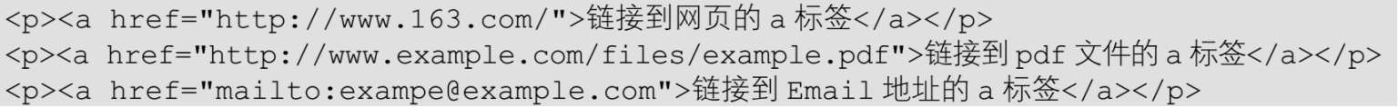 以上代码定义了3个a标签,分别链接到URL、文件和E-mail地址。