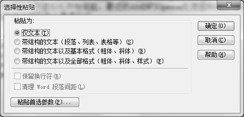 直接按Ctrl+V组合键粘贴过来的文字往往带有原来的格式。如果只想保留文本,可以选择“编辑”菜单中的“选择性粘贴”命令,在弹出的“选择性粘贴”对话框里面选择“仅文本”单选项,如图6-2所示。