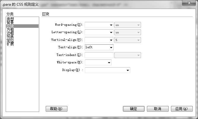 step 2 在如图6-9所示的对话框左侧的“分类”列表里面,选中“区块”选项。在右边的属性面板里面单击“Text-align”下拉菜单右边的箭头,选择“”left选项,如图6-10所示。单击“确定”按钮,关闭对话框。