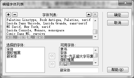 step 1 单击“字体”下拉菜单右边的箭头,Dreamweaver会显示一个默认的字体列表。通常情况下,中文字体(如宋体等)都没有出现在这个字体列表中。如果需要添加这些字体,可以选择字体列表的最后一项“编辑字体列表”,弹出“编辑字体列表”对话框,如图6-6所示。在图6-6中右下角的“可用字体”列表里面选中需要的字体,单击“选择的字体”列表和“可用字体”列表之间的“<<”按钮,就可以把字体添加到左边的列表中。在最上面的列表中,还可以修改字体的顺序,把最常用的字体放在最前面。单击“确定”按钮,就可以关闭对话框。