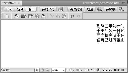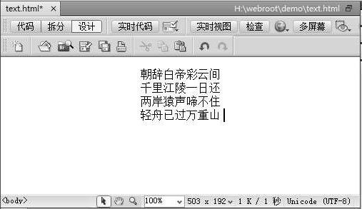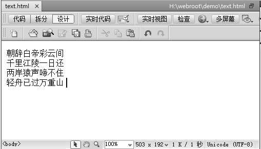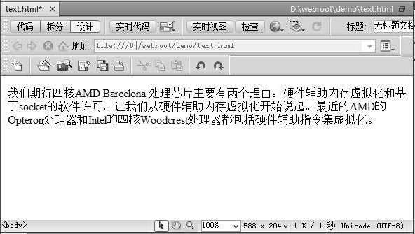 step 2 使用鼠标单击文档窗口的设计视图中的空白处,输入一些文字,如图6-1所示。如果输入的文字超出文档窗口的边界,则会自动换行。如果在某个位置强制换行,则把光标移到要换行的位置,然后按住Shift键,再按回车键。这个操作实际上是插入一个br标记。