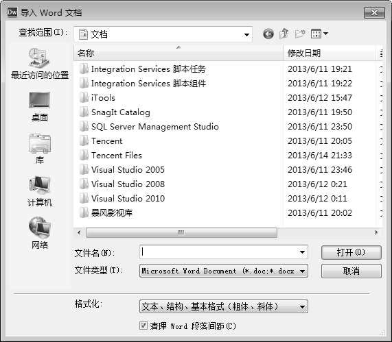 step 2 选中要导入的Word文档,在“格式化”下拉列表中选择合适的选项,单击“打开”按钮,即可把目标文档导入到当前的HTML文档中。