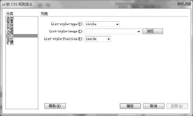 step 4 在弹出的“ul的CSS规则定义”对话框的左边选择“列表”选项,在右边的面板里面把“List-style-type”设置为“circle”“,List-style-Position”设置为“inside”,如图6-17所示。单击“确定”按钮,关闭对话框。此时,可以在设计视图中看到项目列表前面的圆已经变成了圆圈,如图6-18所示。