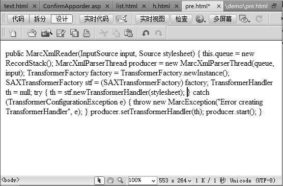 如果没有使用pre标签,则这些代码就会集中在一行里面,直到超出显示范围才会换行,如图6-20所示。如果把这些代码放到pre标签内部,则会按照原来的格式显示在HTML文档中,如图6-21所示。