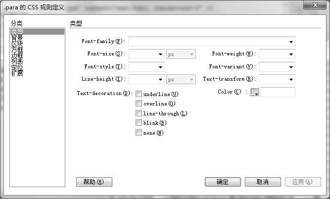 step 1 在文本的属性检查器中的“CSS”面板中,单击“编辑规则”按钮,弹出“新建CSS规则”对话框,在“选择器名称”中输入单击“确定”按钮弹出“para,,.para的CSS规则定义”对话框,如图6-9所示。