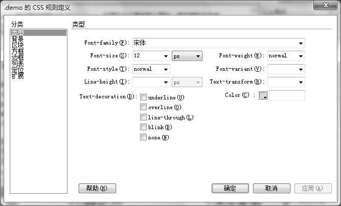 step 3 单击“类型”里面的“Font-family”下拉菜单右边的箭头,在字体列表里面选择“宋体”,“Font-size”选择“12px”“,Font-weight”选择“normal”“,Font-style”选择“”normal。单击“确定”按钮,关闭对话框。