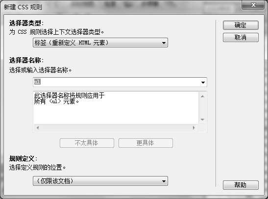 step 3 在“选择器类型”下拉菜单里面选择“标签(重新定义HTML元素)”选项,“选择器名称”输入“ul”或者选择“ul”选项。单击“确定”按钮,如图6-16所示。