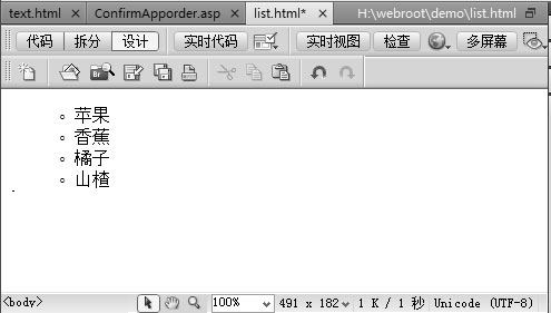 step 1 新建一个空白HTML文档,单击插入工具栏中“文本”面板里面的“ul”按钮,插入一个项目列表。然后输入一些项目,如图6-15所示。