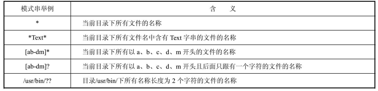 ● “*”代表任意长度的字串,如“L*”匹配以L开头的任意字串。但应注意,文件名中的圆点(。)和路径名中的斜线(/)必须是显式的,即不能用通配符替代它们。例如,“*”不能匹配 .c,而“.*”才可以匹配 .c。